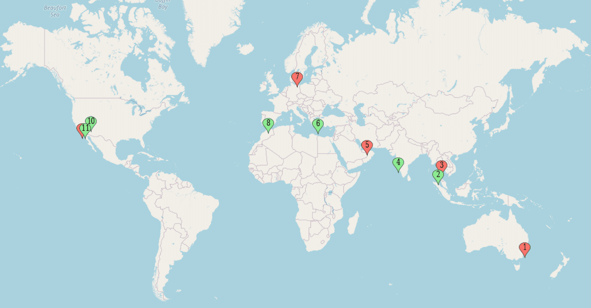 Itinerary overview. The red pins are city stays, while the green pins are beach/wilderness retreats