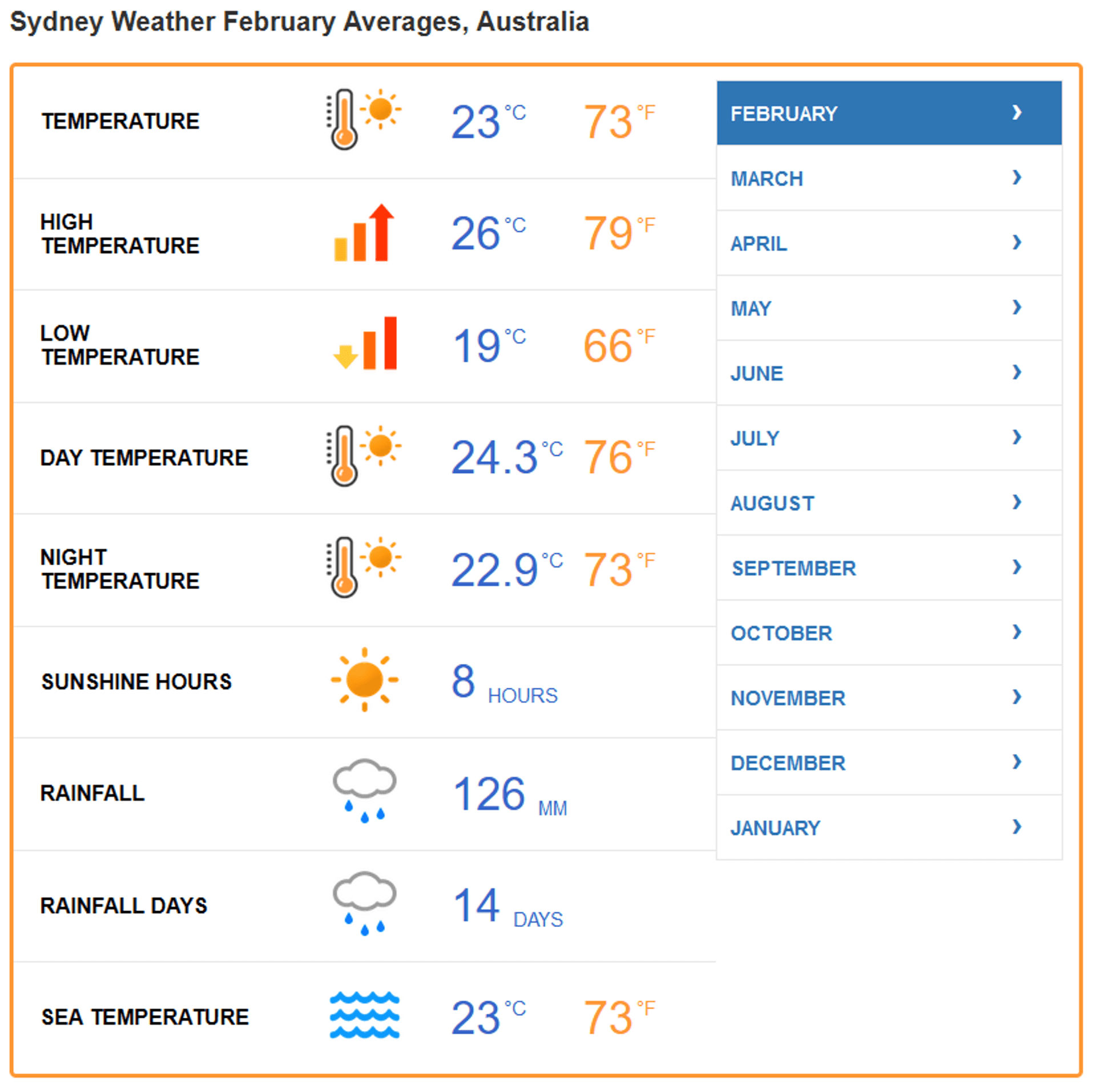 During summer, average temperatures in Sydney are between 19 - 26°C, and water temperatures rise to 22 - 24°C.