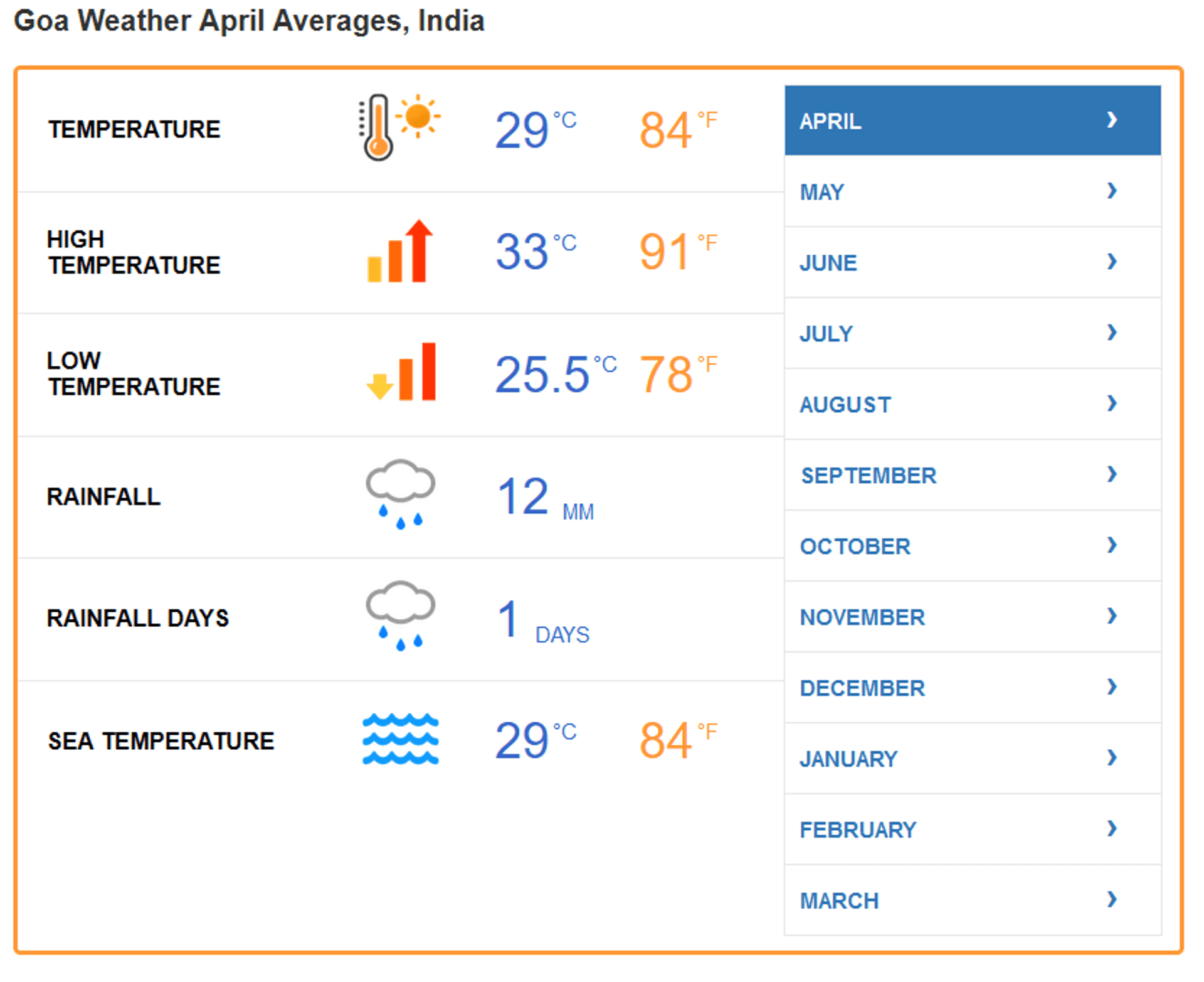 Helen and I were considering Goa as our honeymoon destination, but decided on Hillside Beach Club in Turkey instead. It's been on my radar ever since, and it would be a shame to not go have a look, considering I haven't been to India before and the weather in April looks like this: